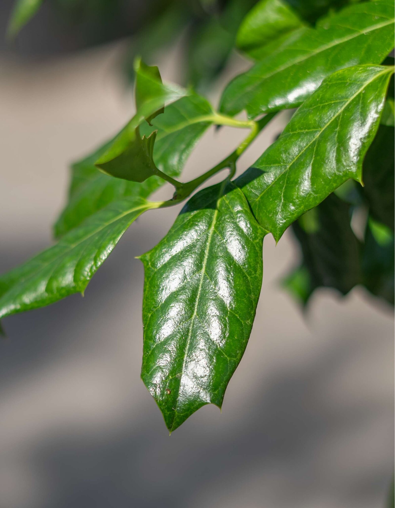 dunkelolivgrün, glänzend, spitze Zähne, immergrün
